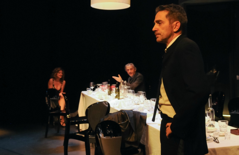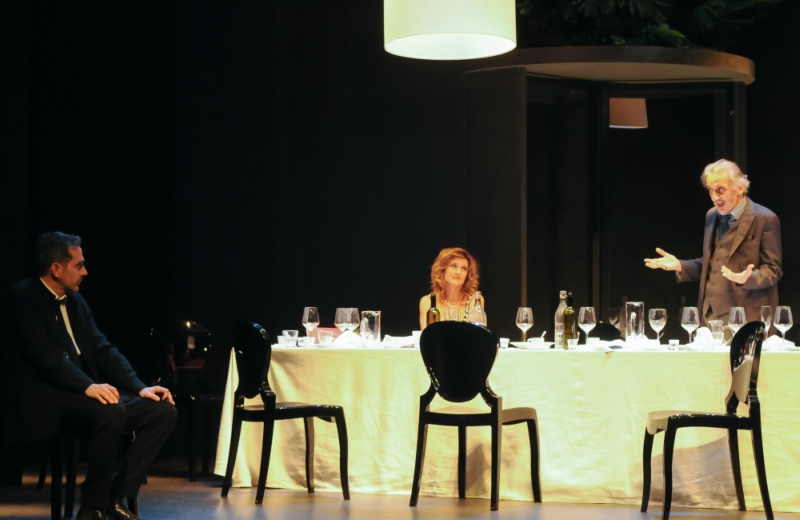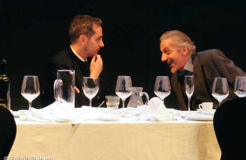 L’intelligente regia di Piero Maccarinelli parte dall’idea scenografica di una lunga tavola con piatti e bicchieri usati e ormai vuoti, efficace evocazione di un’opulenza tramontata e poi aiuta il testo nel suo continuo proporre diversivi; così incuriosisce e intrattiene per tutti i novanta minuti filati.