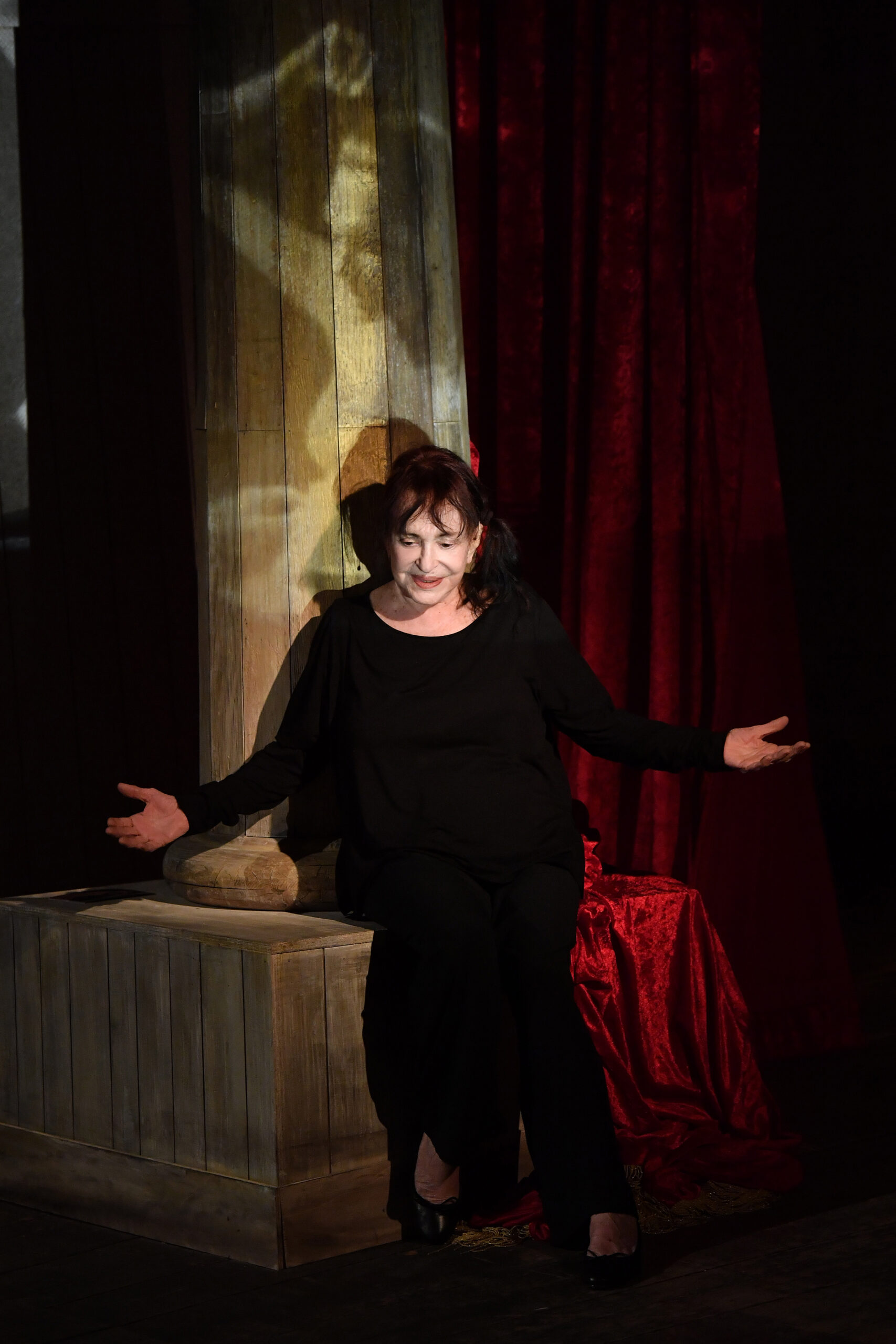 Fantasie, pensieri, racconti prendono vita, mescolandosi al teatro. A raccontare non sono soltanto gli episodi di una lunga carriera, le ansie del palcoscenico, gli incontri con i più grandi registi di teatro e di cinema, i travestimenti e le nudità, la leggerezza e la follia. A raccontare è il meccanismo stesso di questo spettacolo, la scelta di apparire senza rivelarsi, di guardarsi da fuori quasi con distacco, riversando su quell’altra se stessa ironia e rabbia, irritazione e tenerezza. Dentro questo meccanismo in cui nessuno gioca solo la sua parte, c’è un direttore del teatro che si vergogna della sua coda leonina, c’è un tecnico che vorrebbe non sentirsi una gallina che in realtà è un pollo, c’è un ammiratore che colleziona ricordi. E soprattutto c’è lei, e c’è l’altra: una impigliata nelle tavole del palcoscenico, l’altra in camerino, a guardarsi allo specchio e cercare un nuovo trucco. Sempre a sentirsi fuori posto, per poi scoprire che forse l’unico posto è il teatro, perché totalmente illusorio.