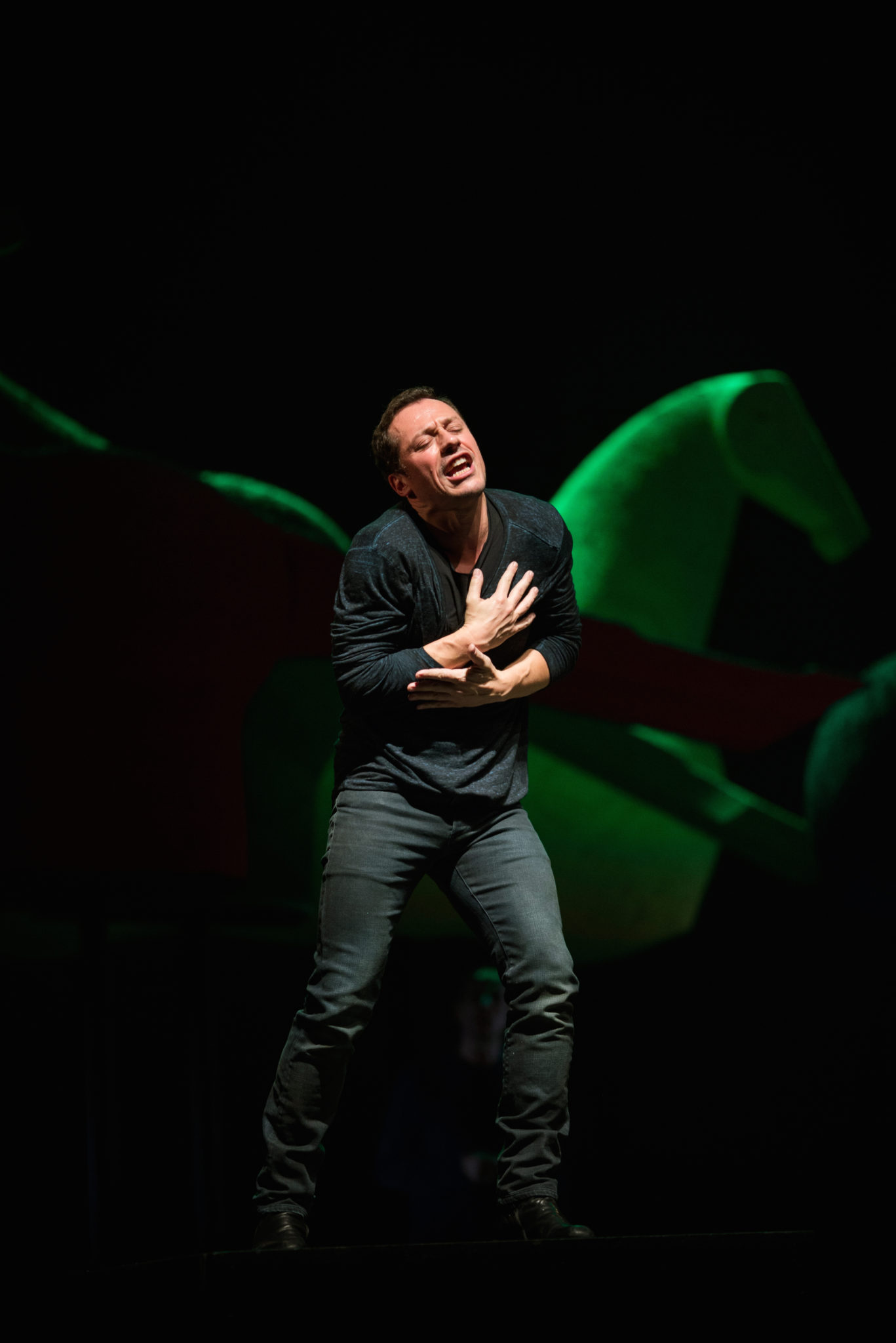 In una scena dominata dalla sola presenza dei colossali cavalli di Mimmo Paladino, l’attore scorrazza in rima tra feroci saraceni, ippogrifi alati, giovani donzelle e paladini cristiani, alternando alle ottave originali quelle un po’ più prosaiche di Baliani.