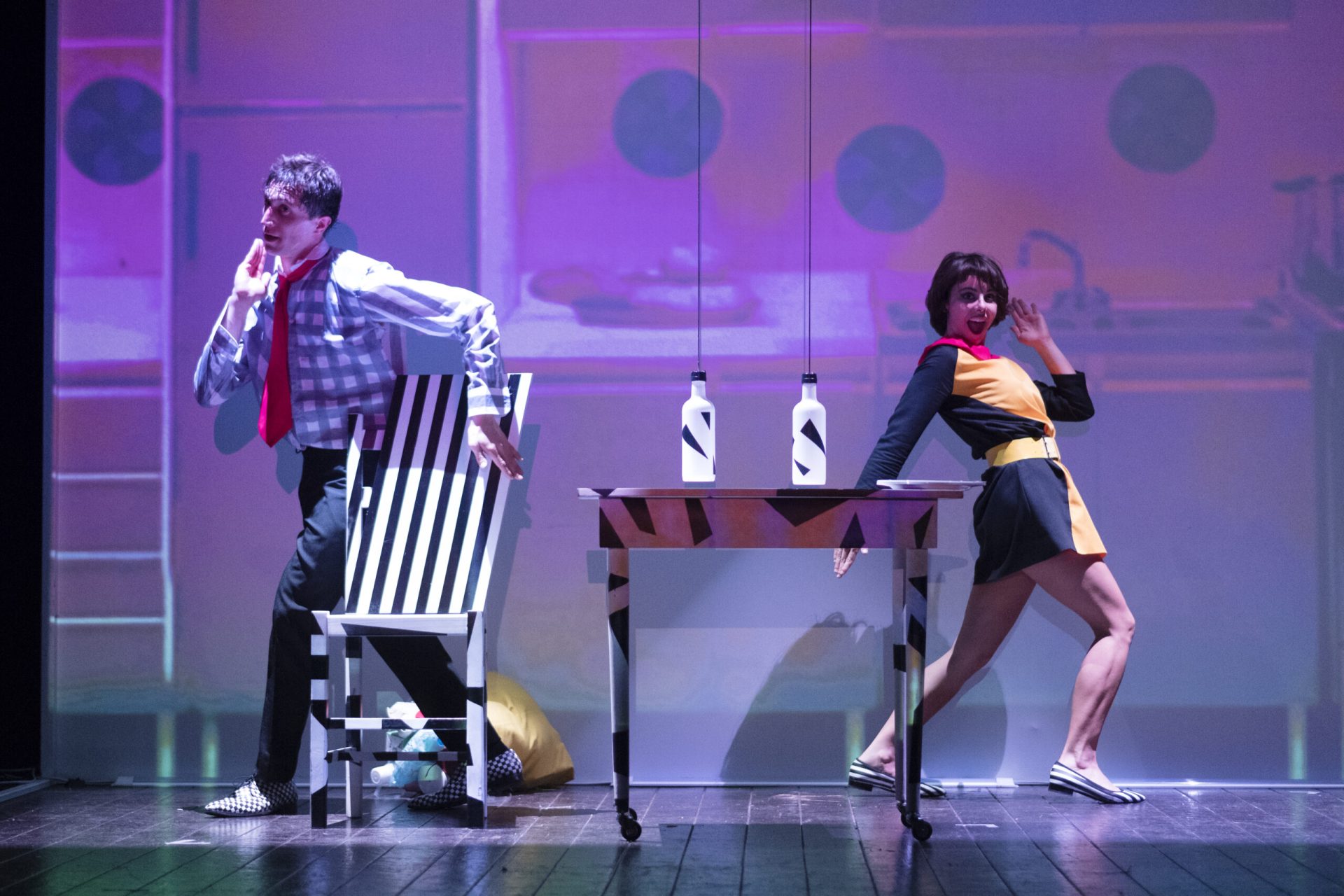 Una griglia spaziale crea dodici ambienti per dodici diverse scenografie con un sistema di architetture di luce realizzato con filmati e diapositive. Tre abitanti attraversano una casa: dal salotto alla cucina, dal tetto al giardino, dalla piscina al bagno. Un’avventura domestica dall’esterno all’interno dell’abitazione ma anche un viaggio figurato dall’ordinario al fantastico, dalla musica al suono, dal gesto al movimento.