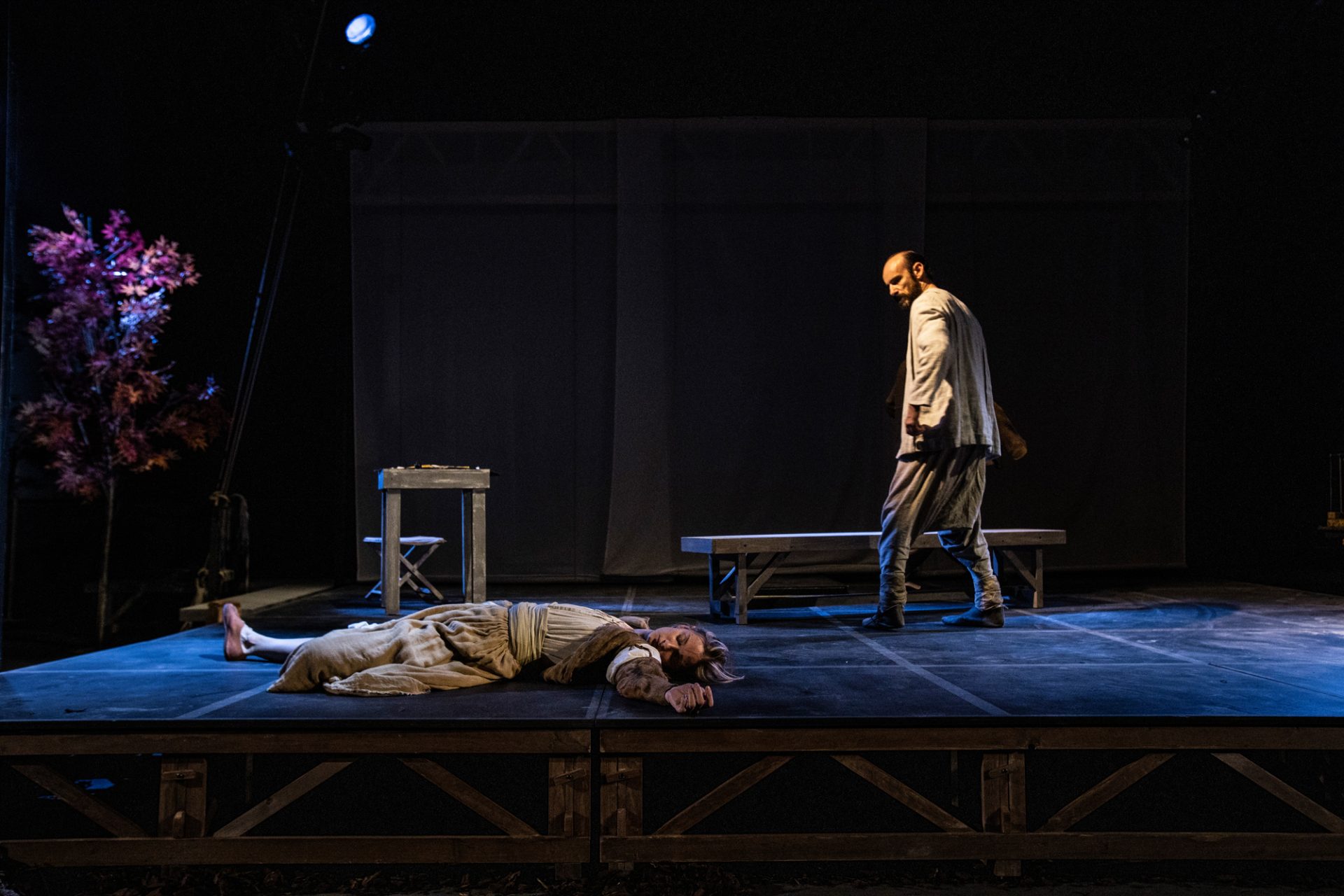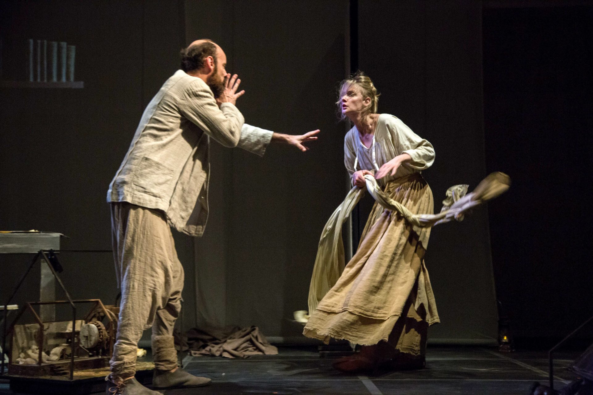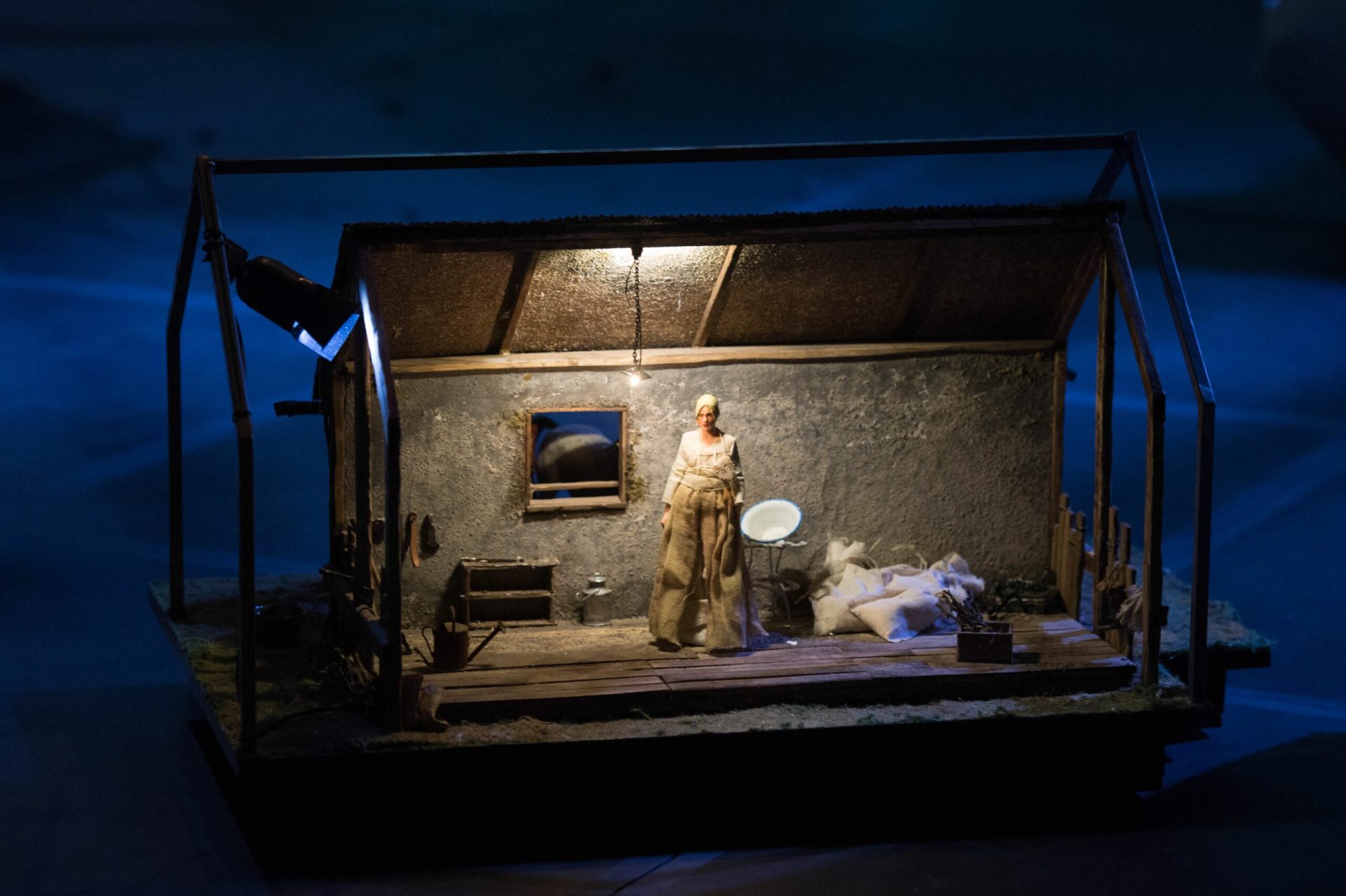 La scena firmata da Margherita Palli si sviluppa su due livelli, raccontando con modellini in scala i luoghi rurali agiti dagli stessi attori, ed esaltando con una stilizzazione dello spazio scenico l’eco contemporanea del testo.