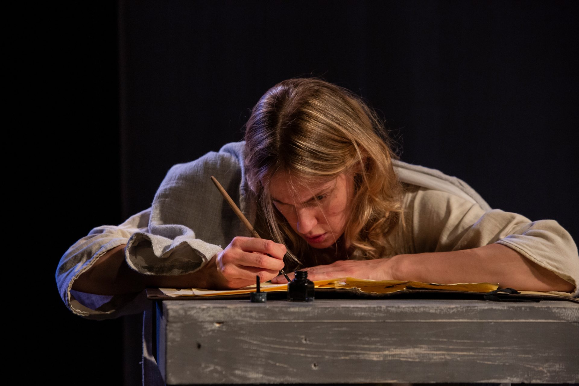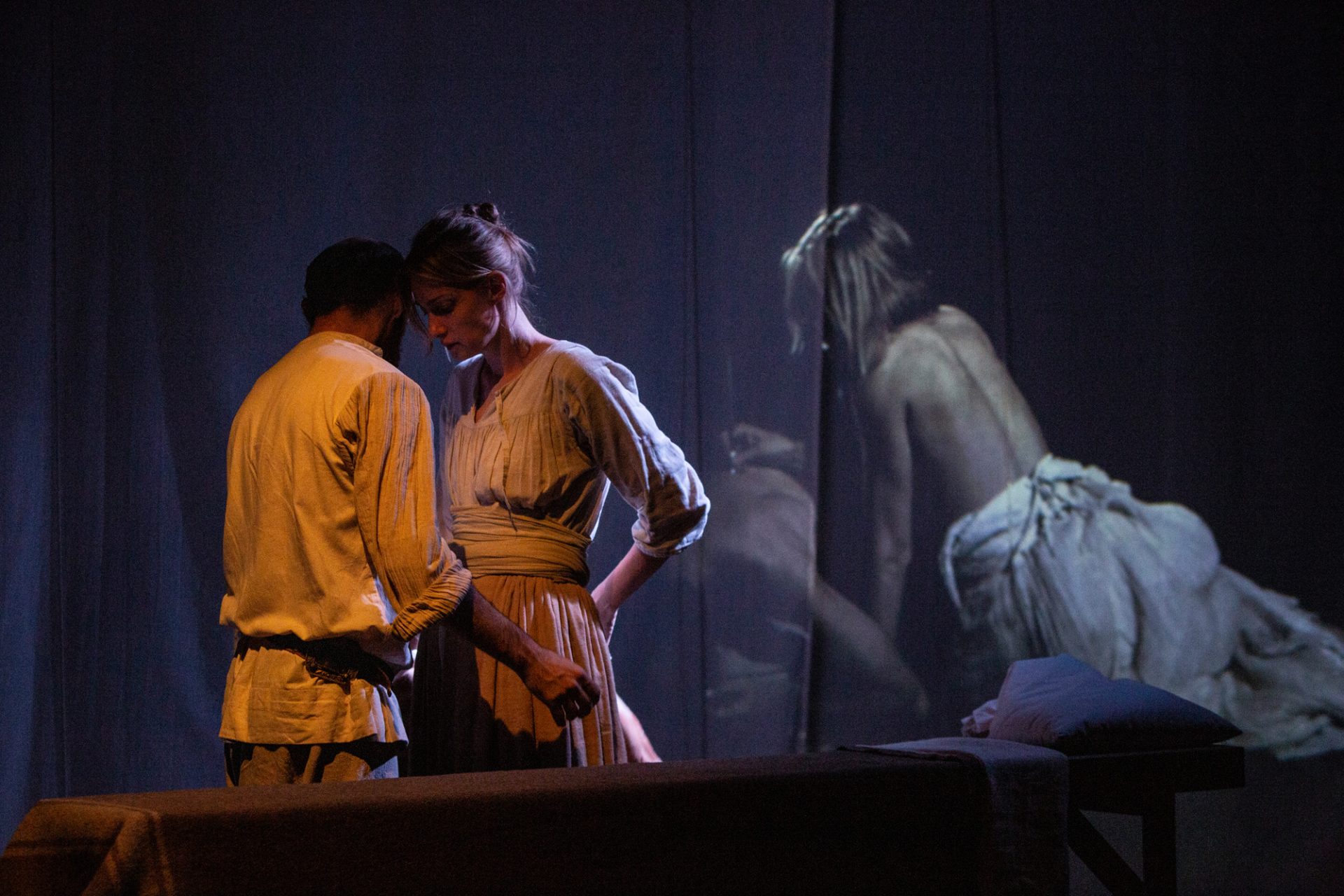 La storia, anzi, la favola, perché di questo si tratta, è divisa in 24 quadri potenti, di difficile ma affascinante impaginazione, e doveva essere raccontata con ritmi incalzanti. Ogni scena comincia che è già iniziata e termina quando non è ancora finita, rimandando a quella successiva. Non è stato facile evitare la frantumazione e mantenere viva la tensione del racconto e degli attori, quadro dopo quadro, immaginando di aumentare, nel pubblico, l’attesa per quello che sta per avvenire. Anche per questo, per coinvolgere ulteriormente lo spettatore, il palco è posto a meno di un metro dal pubblico, catapultandolo all’interno delle scene, rendendolo così parte dello spettacolo.