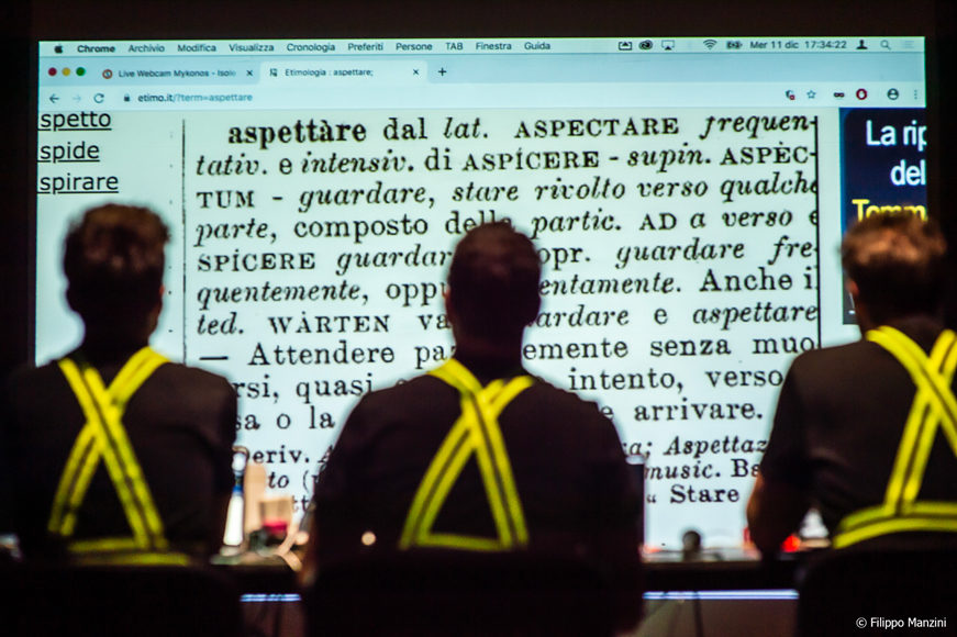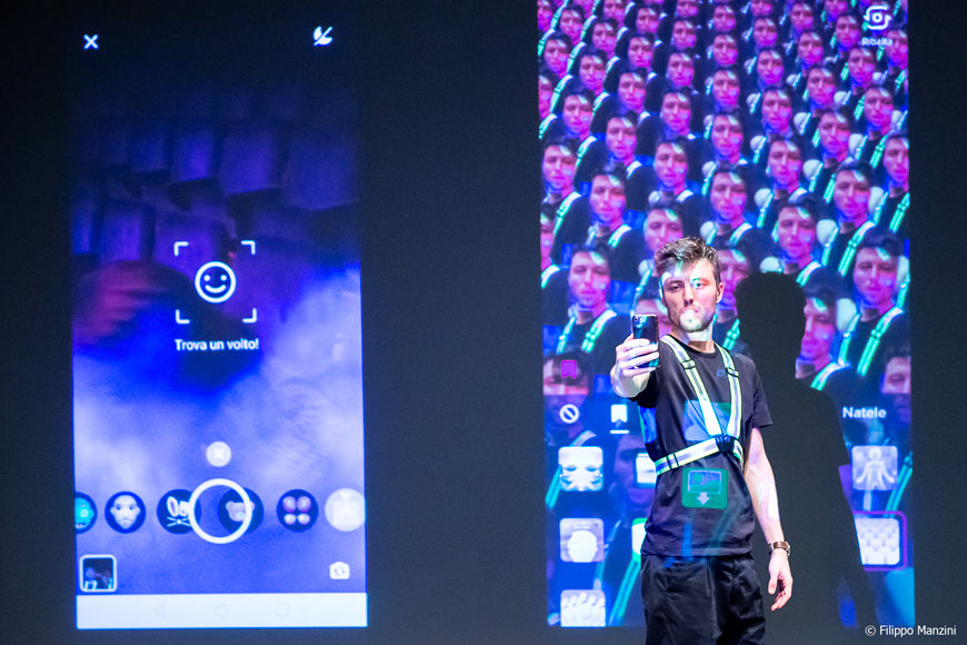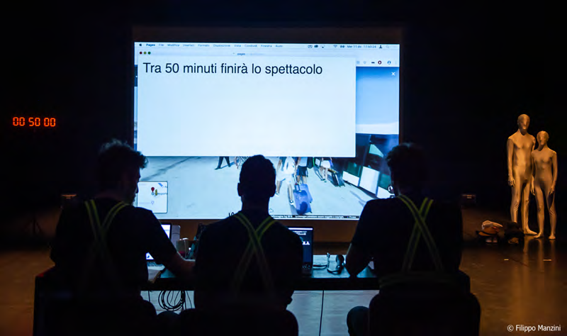 Gli spettatori saranno inseriti in un gruppo whatsapp e avranno potere decisionale sullo svolgimento della performance grazie al grande schermo che, come una finestra-specchio, permette a performer e spettatori di affacciarsi e interagire con il mondo online e dei social.