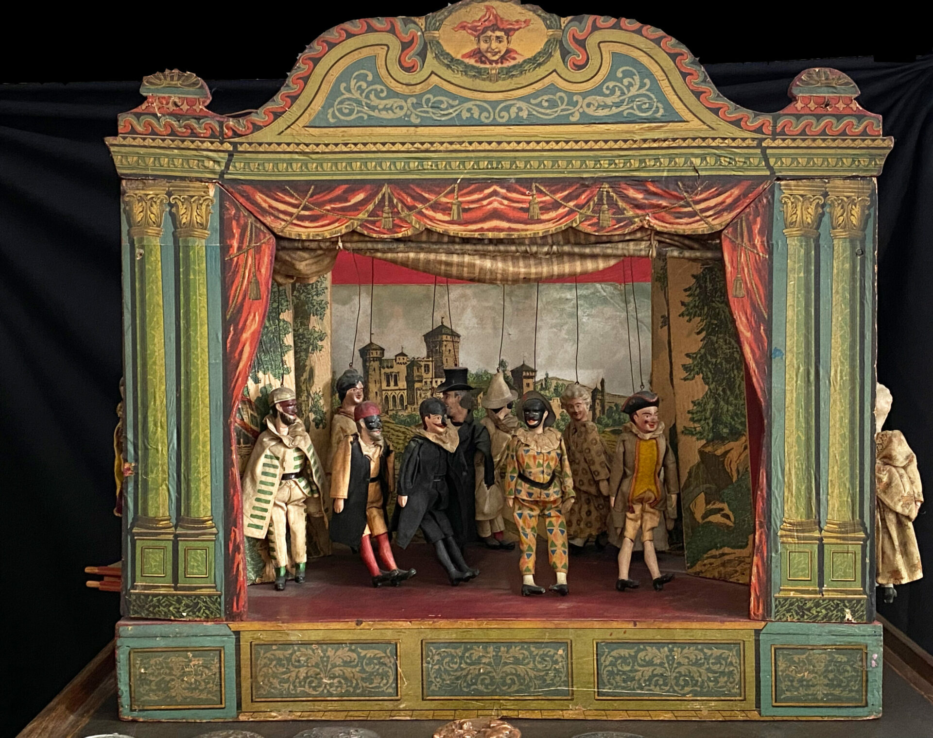 Tra i diorami teatrali di Engelbrecht, bellissime marionette viennesi in biscuit colorato, burattini futuristi degli Anni Venti raffiguranti personaggi come D’Annunzio, Mussolini, Giolitti, Vittorio Emanuele, Don Sturzo e Nitti, e teatri lignei, la mostra si compone di tutti quei meravigliosi oggetti che hanno trasformato la casa di Bagliani in un vero e proprio spazio scenico.