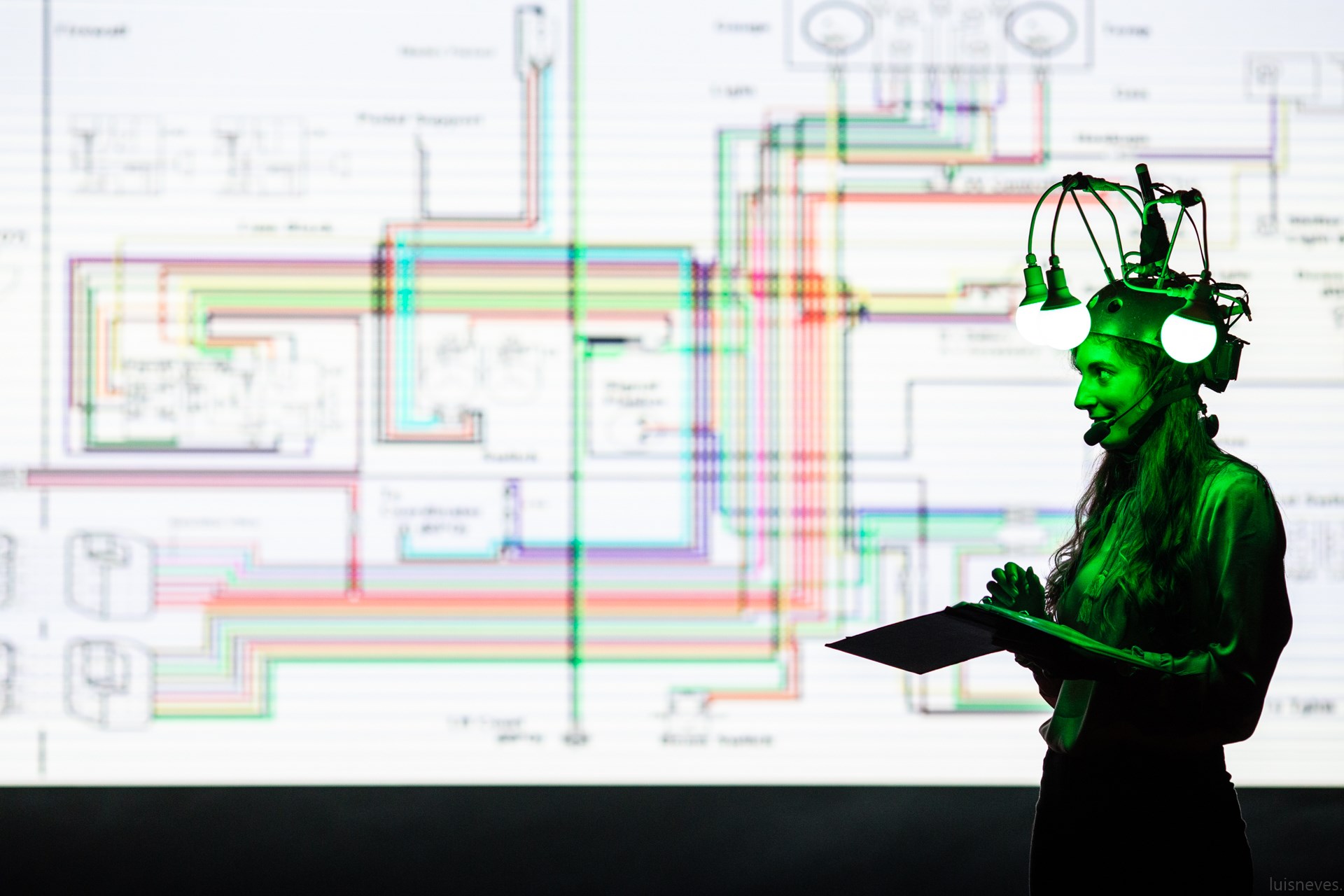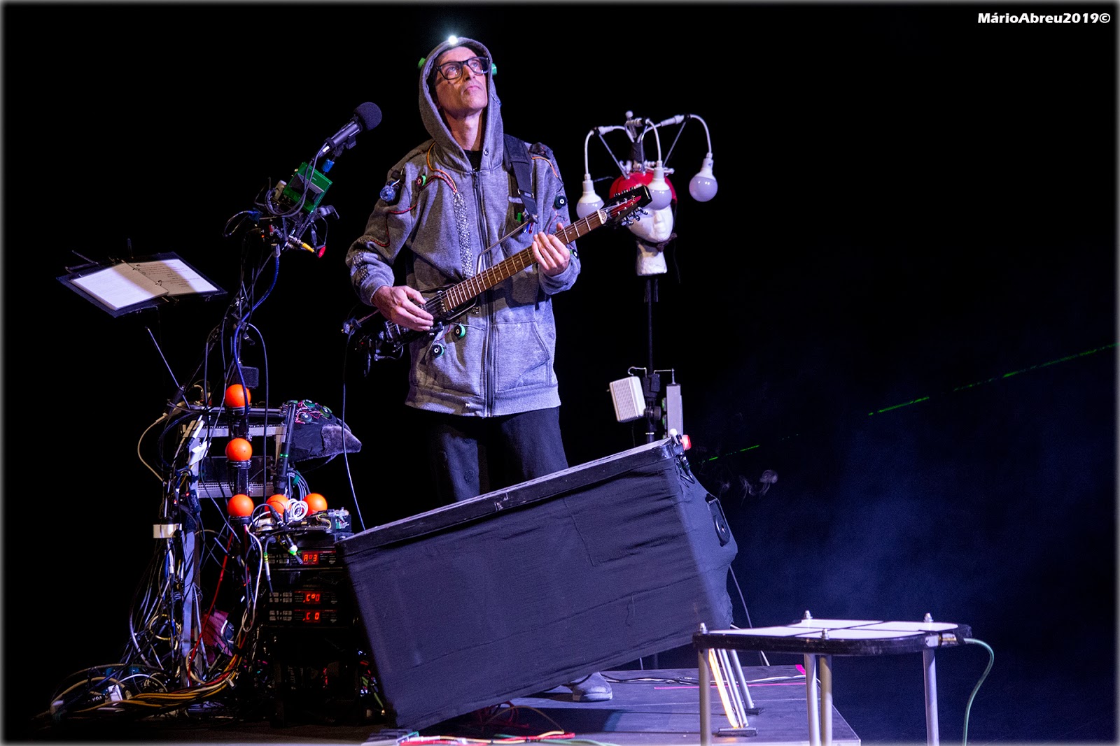 Grazie alla tecnologia all’avanguardia incorporata nei costumi e negli strumenti musicali – risultato di una ricerca decennale – Kulu Orr suona tutta la musica dal vivo, monta video in tempo reale, esegue abilità circensi e controlla tutte le luci.