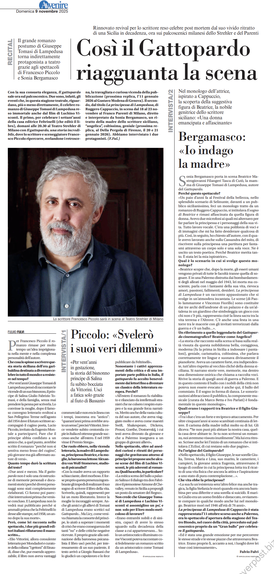 Il grande romanzo postumo di Giuseppe Tomasi di Lampedusa torna protagonista a teatro grazie agli spettacoli di Francesco Piccolo e Sonia Bergamasco Con la sua consueta eleganza, Il gattopardo sale ora sul palcoscenico. Due sono, infatti, gli eventi che, in questa stagione teatrale, riguardano, più o meno direttamente, il celebre romanzo di Giuseppe Tomasi di Lampedusa reso immortale anche dal film di Luchino Visconti. Il primo, per celebrare i settant’anni della casa editrice Feltrinelli (che editò il libro), domani alle 20.30 al Teatro Strehler di Milano con Il gattopardo, una storia incredibile, dove lo scrittore e sceneggiatore Francesco Piccolo ripercorre, svelandone la travagliata e curiosa vicenda della pubblicazione (prossima replica, l 11 gennaio 2026 al Gustavo Modena di Genova). Il secondo, dal titolo La principessa di Lampedusa, di Ruggero Cappuccio, in scena dal 18 al 23 novembre al Franco Parenti di Milano, diretto e interpretato da Sonia Bergamasco, un ritratto della madre dello scrittore siciliano, “angelica”, coltissima, geniale (prossima replica, al Della Pergola di Firenze, il 20 e 21 gennaio 2026). Abbiamo intervistato i due protagonisti.