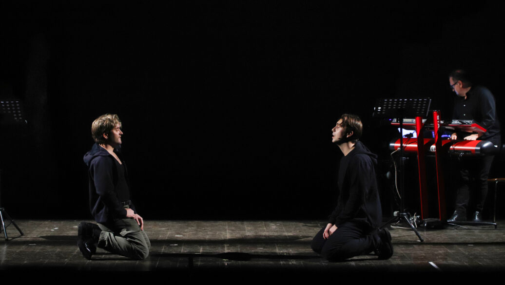 Se la componente sonora — tra sirene, spari e bombe — riesce a restituire con efficacia la tensione del conflitto, la drammaturgia sembra a tratti scivolare in un registro lezioso. I dialoghi rischiano di cadere in una retorica che anestetizza l’emozione invece di alimentarla. Resta infatti il sospetto che la traduzione del testo originale non riesca a restituire appieno la forza del conflitto interiore dei personaggi, lasciandoci davanti a un amore che, come quella luna sul fondale, appare purtroppo solo bidimensionale.