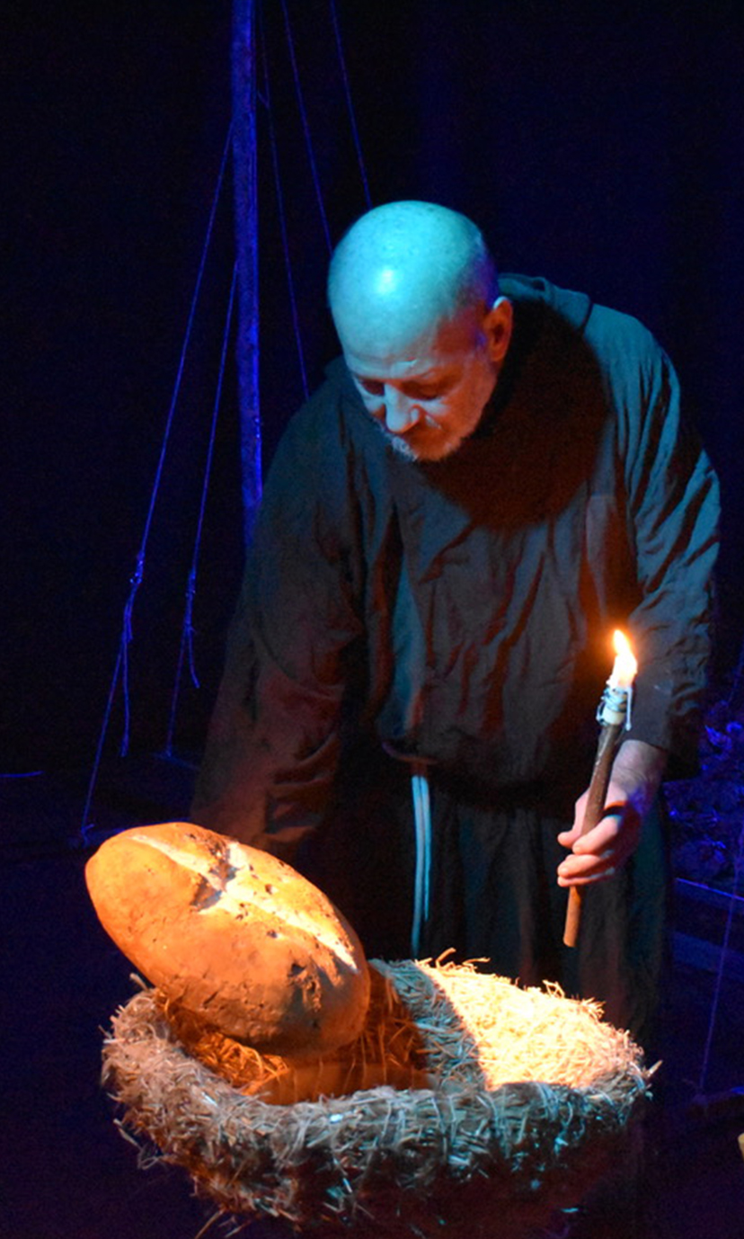Sul palco, pochi oggetti poveri si trasformano in strumenti di gioco e di magia, dando vita a un susseguirsi di racconti: dalla nascita del Presepe a Greccio alla predica agli uccelli, dall’incontro con il lupo di Gubbio alla scrittura del Cantico delle Creature, fino al silenzio della sua morte. Francesco emerge così non come un’icona distante, ma come un uomo che trasforma fragilità in coraggio e ogni gesto semplice in profezia.