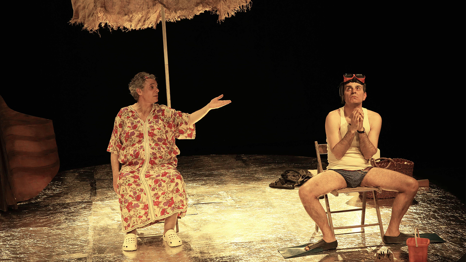 Il loro è un matrimonio durato quarant’anni e questo non è un giorno qualsiasi della loro vita. Lei è condannata all’immobilità come una Winnie di Giorni Felici in riva al mare. Lui è devoto, stanco, attraversato da picchi di follia e silenzi poetici. Nessuno dei due è nato per dare voce ai sentimenti in modo intonato. La loro è una comunicazione fatta di intimità silenziosa e di risate improvvise, furie e riconciliazioni, pianti e mazzate sulle ginocchia.