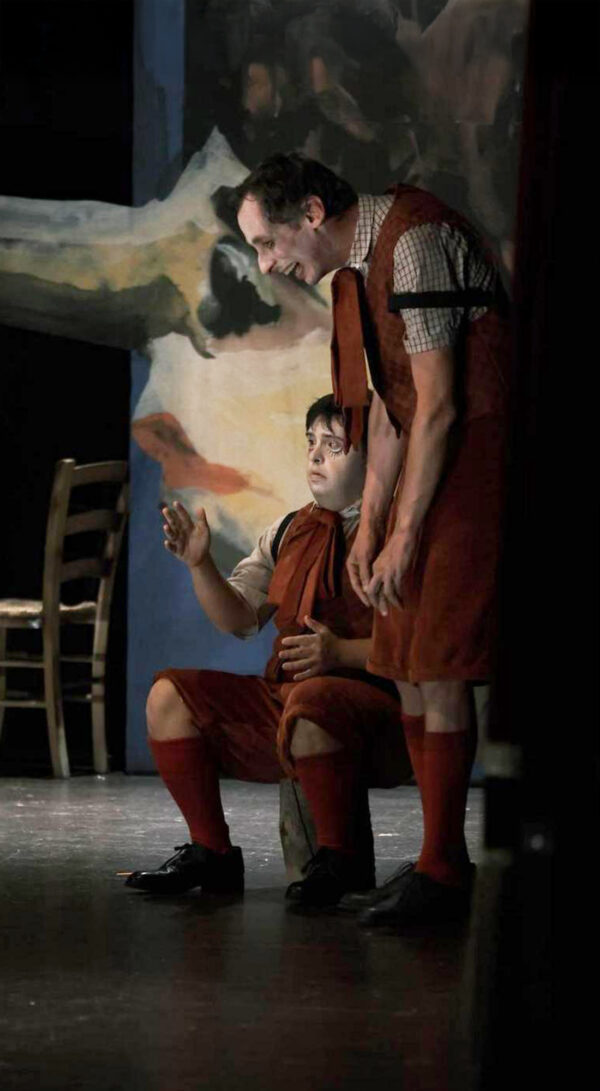 Lo spettacolo di Dario D’Ambrosi ripercorre la storia al contrario, dalla pancia del Pesce-Cane fino alla creazione del burattino da parte di Geppetto. Un viaggio a ritroso che interroga lo spettatore: Vale la pena lottare per diventare persone e non restare burattini?