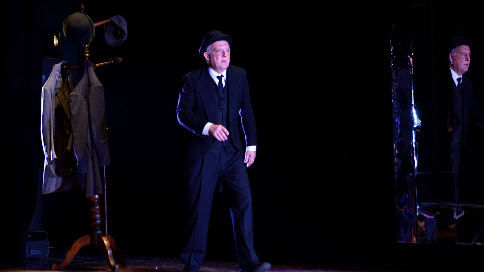 Un grande specchio al centro della scena troneggia come un totem, un portale spazio-temporale, uno squarcio tra la realtà e la finzione. Da questo grande specchio, in un dentro-fuori di cui è impossibile stabilire i confini, emergono due figure, interpretate da due attori di grande esperienza, Federico Grassi e Fabio Bussotti, che di questo gioco teatrale è anche l’autore. Chi sono queste due figure? Sono Unamuno e Pirandello? Sono due attori in un teatro che fingono di essere i personaggi, che fingono a loro volta di essere gli autori? O tutte queste funzioni insieme? O nessuna di queste? L’ubriacatura semantica potrebbe continuare all’infinito, amplificata dagli effetti spettacolari del grande specchio, dalle videoproiezioni che spostano l’ambientazione dalla realtà alla mente, ma tutto alla fine ci riporta nel qui e ora del teatro e delle nostre vite, a interrogarci sulla nostra identità.