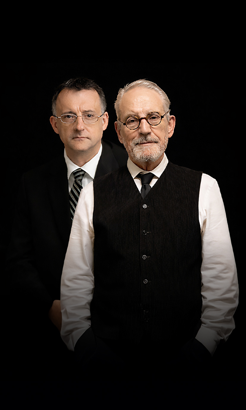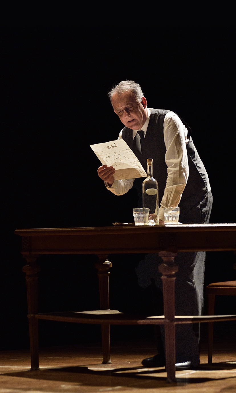 Prendete un grande specchio (dagli effetti tecnologici importanti e inediti), che assurge a terzo protagonista al centro del palco. Incastonate immagini di Magritte, l’uomo con l’ombrello e il “cannocchiale rovesciato” della novella pirandelliana “La tragedia di un personaggio”. Fateli interagire con due scrittori, le cui incredibili parentele e affinità artistiche hanno cambiato per sempre la Storia del Teatro, impersonati da due grandi attori, figli della Bottega di Vittorio Gassman. Ne sgorga una pièce affascinante e complessa.