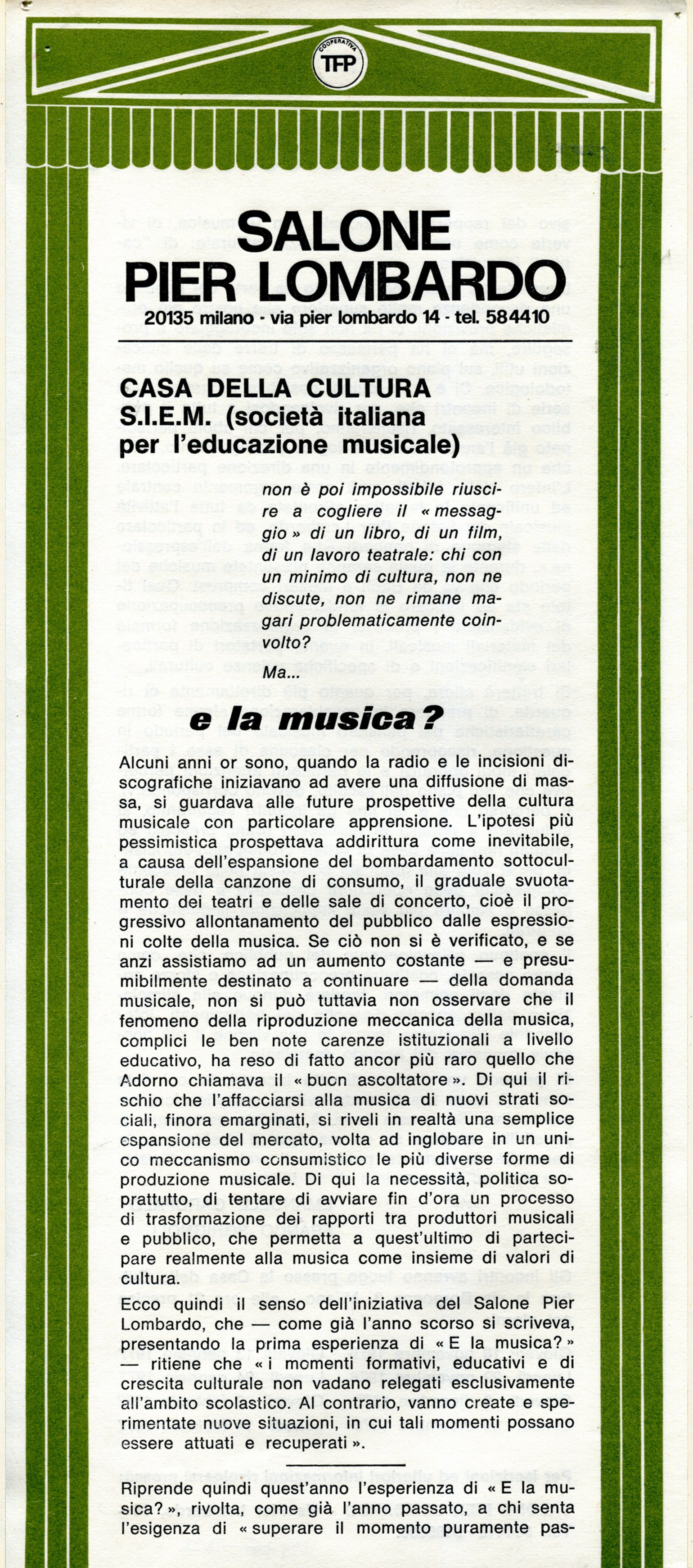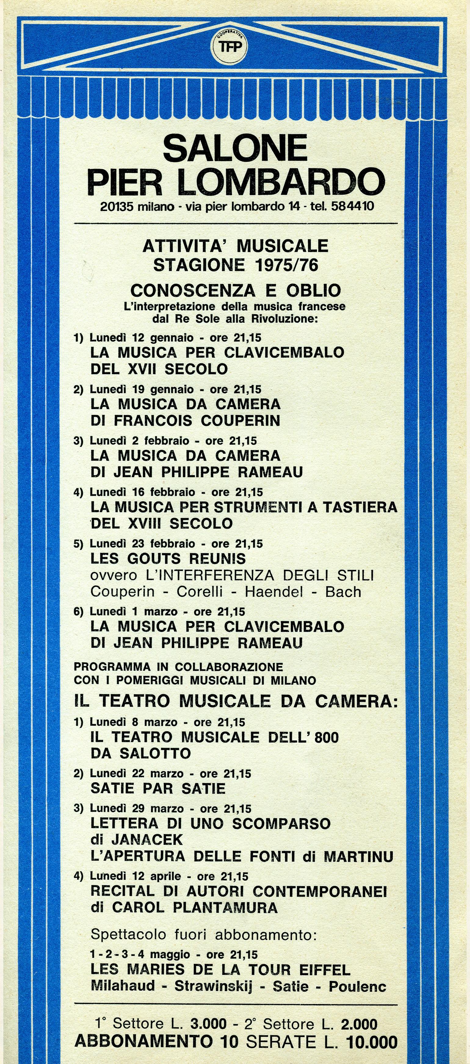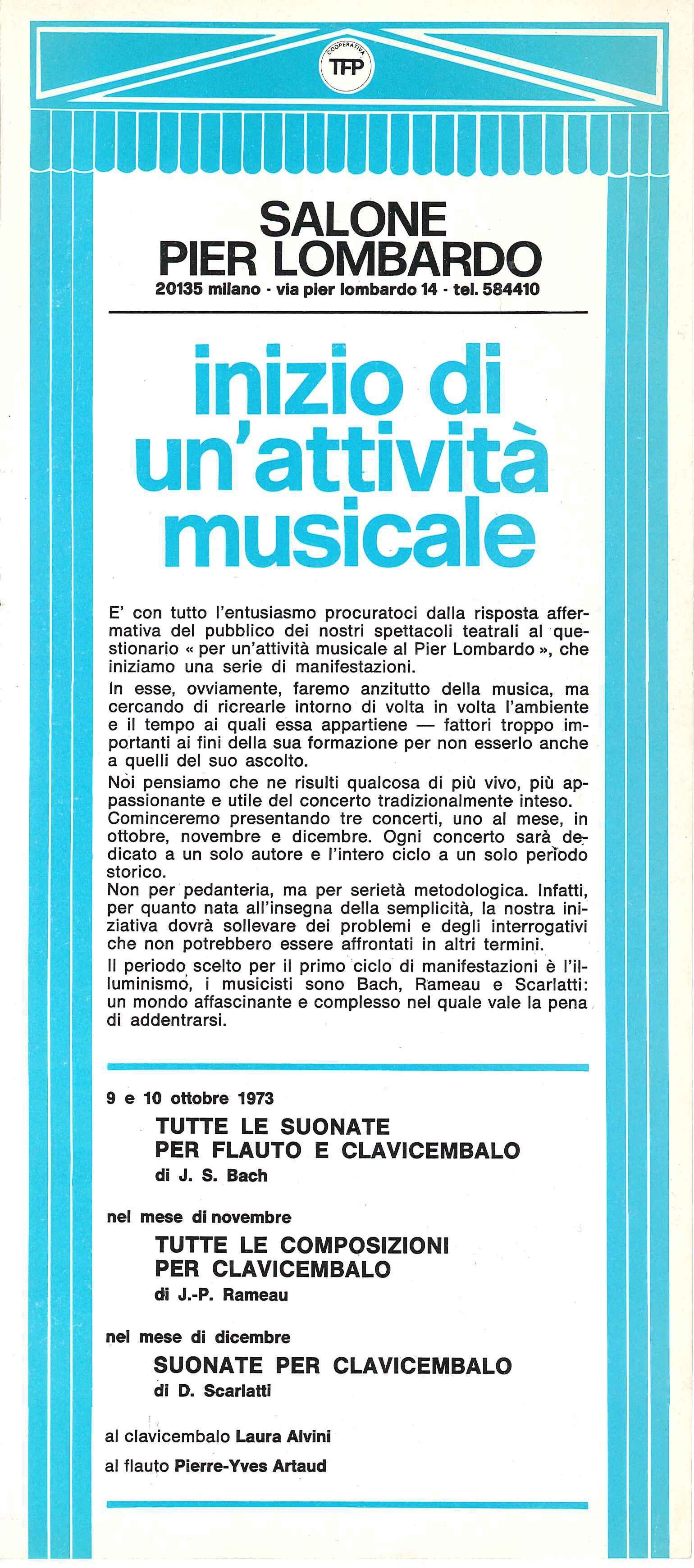 Sin dal 1973, con Laura Alvini, chiamata da Franco Parenti, a collaborare per il Georges Dandin, nasce una collaborazione per aprire al Salone Pier Lombardo una sezione musicale. Dall’anno seguente viene inaugurato un ciclo di musica da camera barocca eseguita con strumenti originali.