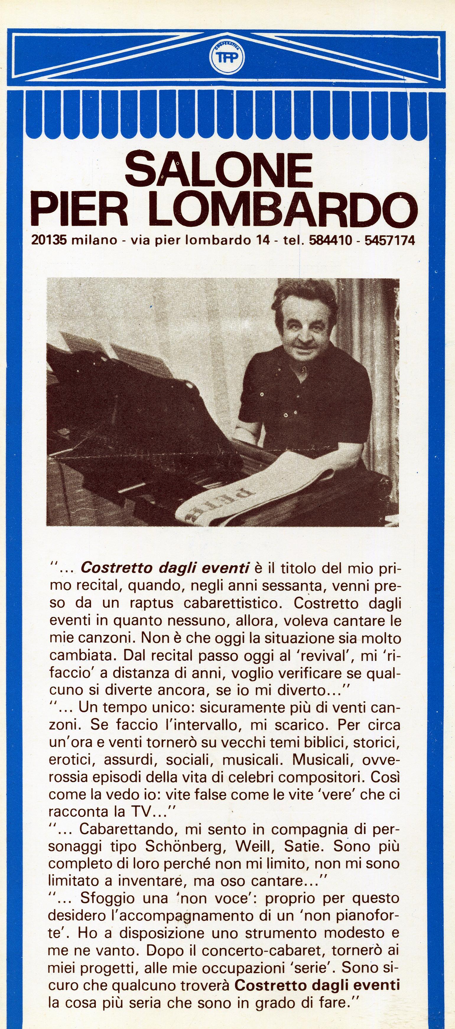Molto spazio è stato dedicato alla canzone popolare con i Cabaret di Gino Negri, con il Nuovo canzoniere italiano con Ivan Della Mea, Maria Monti…. E cantautori italiani, come Franco Battiato, e francesi come Léo Ferré.